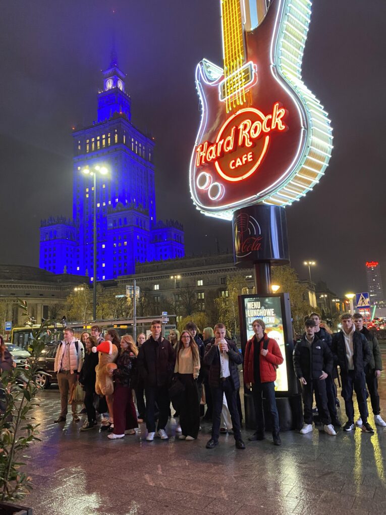 Pierwszym punktem programu był pyszny posiłek w Hard Rock Cafe w Złotych Tarasach, gdzie młodzież mogła nabrać sił przed dalszym zwiedzaniem stolicy. Następnie udaliśmy się na Jarmark Bożonarodzeniowy, którego kolorowe stoiska i świąteczne dekoracje wprowadziły wszystkich w magiczny nastrój. Każdy znalazł tam coś dla siebie – od ciepłych przekąsek po drobne upominki.