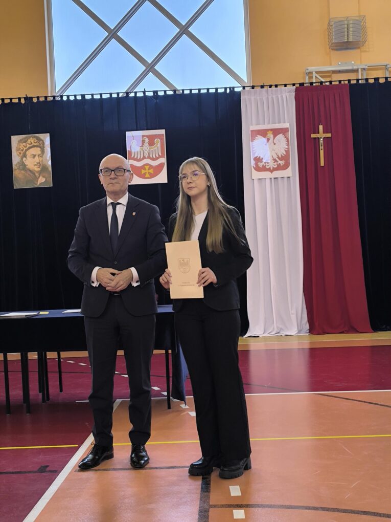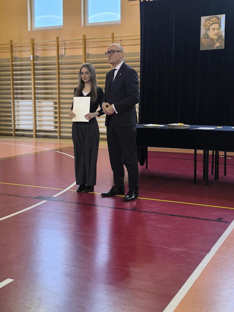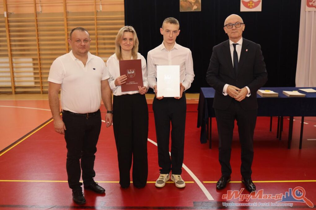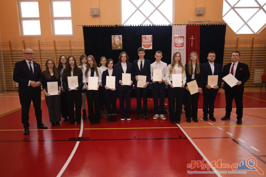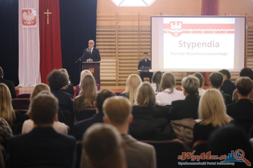 Uczniowie odebrali stypendia z rąk Pana Bogdana Zielińskiego – Starosty Wysokomazowieckiego. Podczas uroczystego wręczenia stypendiów młodzieży towarzyszył Pan Łukasz Godlewski – Dyrektor szkoły.