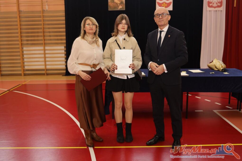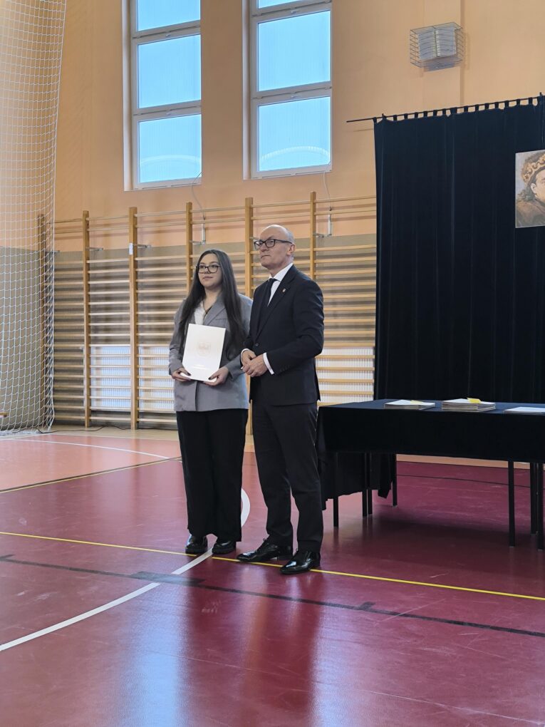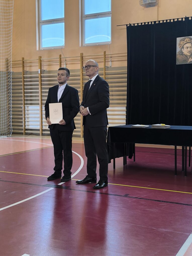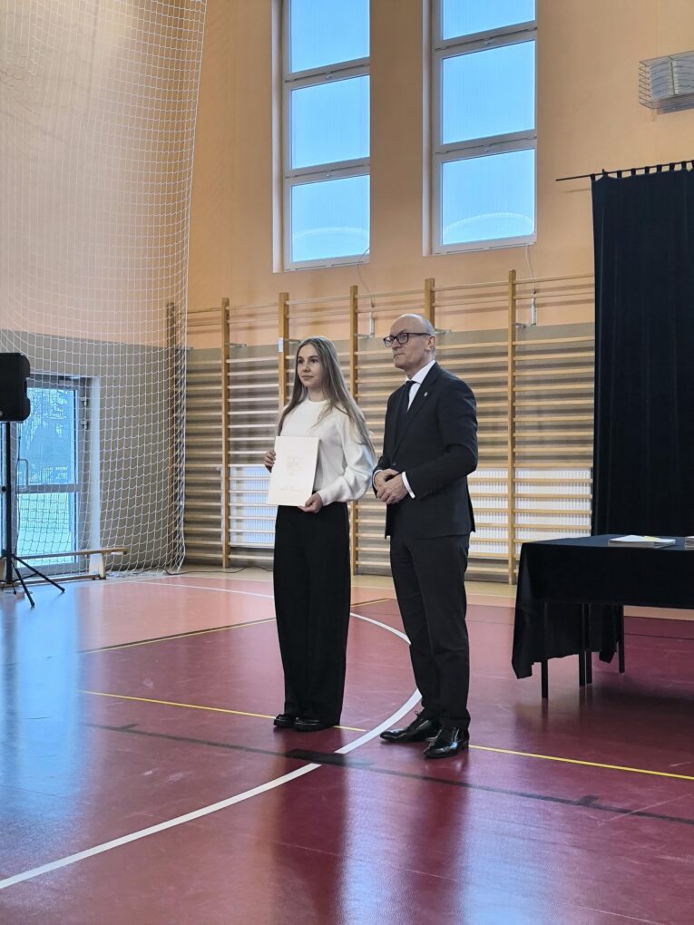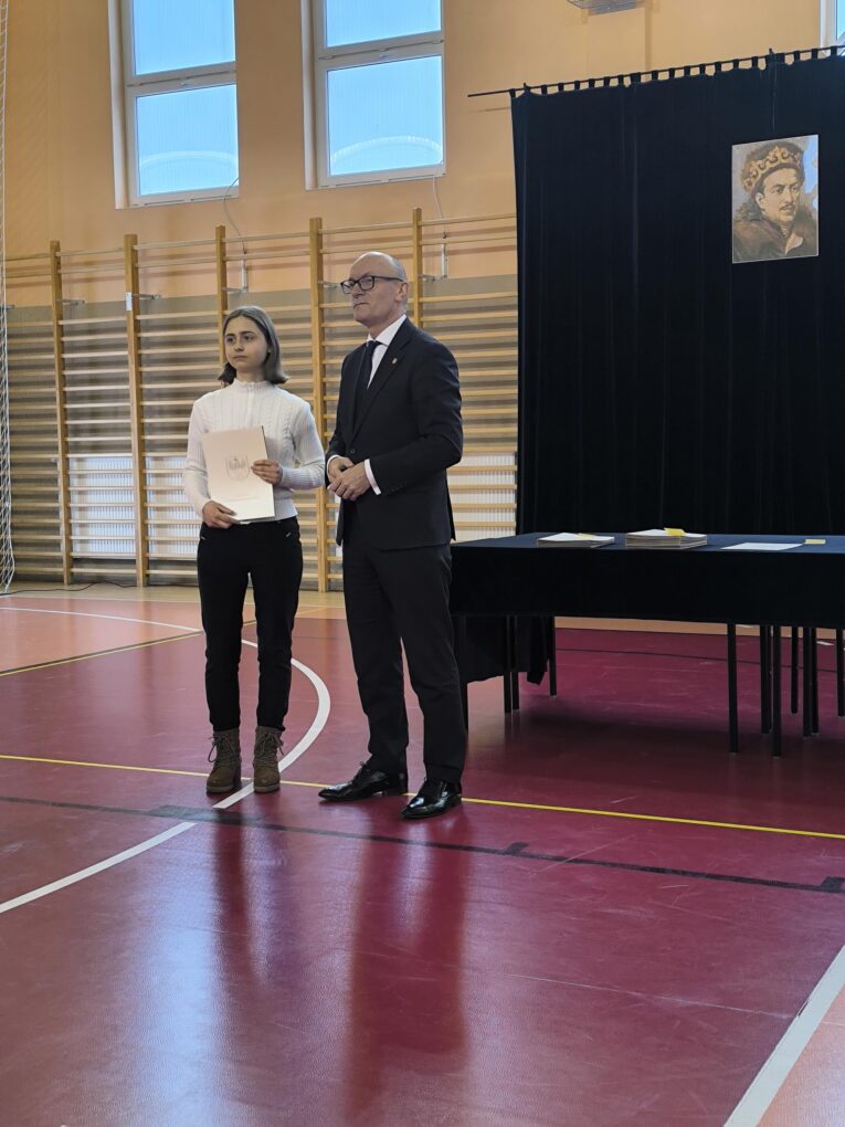 Uczniowie odebrali stypendia z rąk Pana Bogdana Zielińskiego – Starosty Wysokomazowieckiego. Podczas uroczystego wręczenia stypendiów młodzieży towarzyszył Pan Łukasz Godlewski – Dyrektor szkoły.
